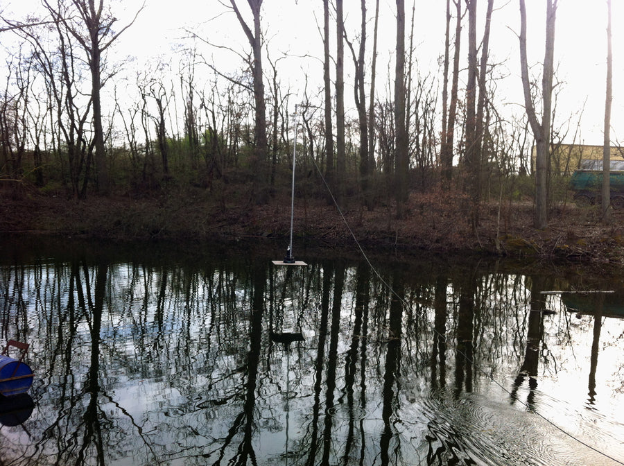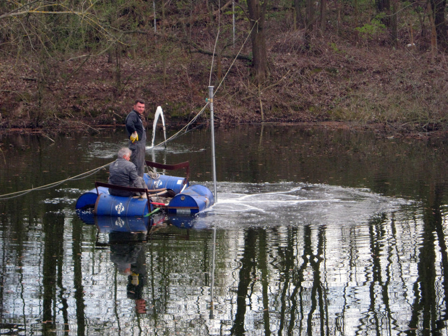 At the premises of Rhein-Main-Umwelt GmbH there is a pond that was not cultivated or cleaned for years. An attempt was made to feed in oxygen using a submersible pump, but this failed due to the size of the pond.