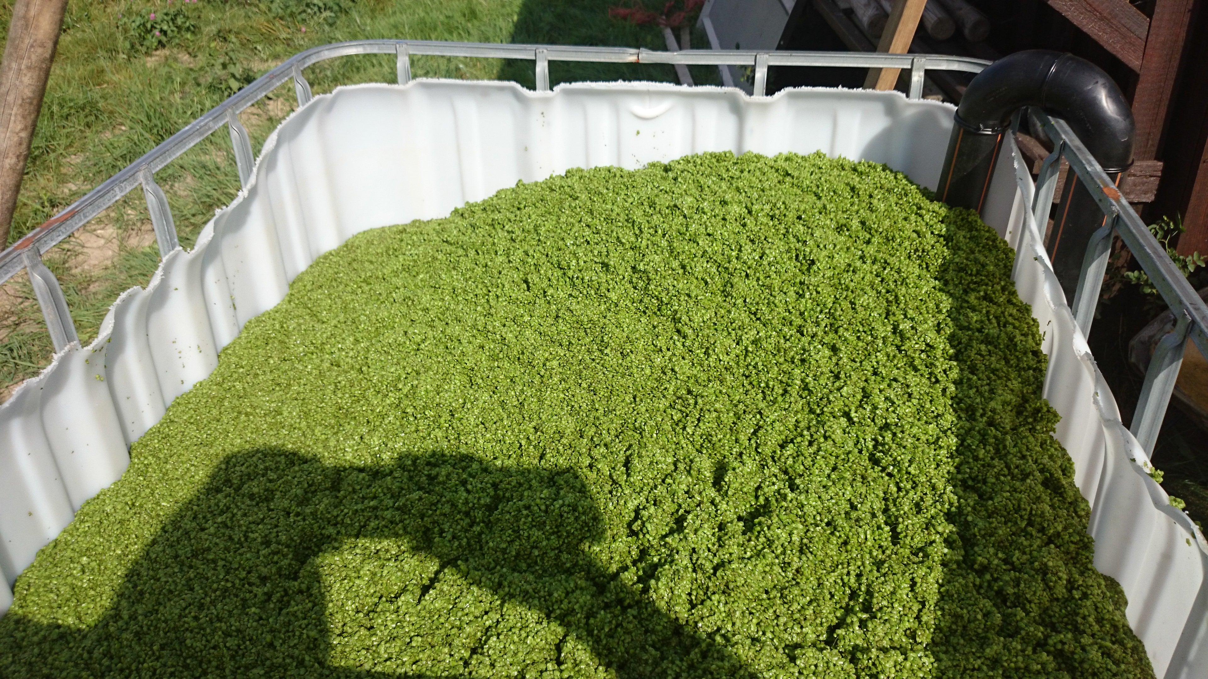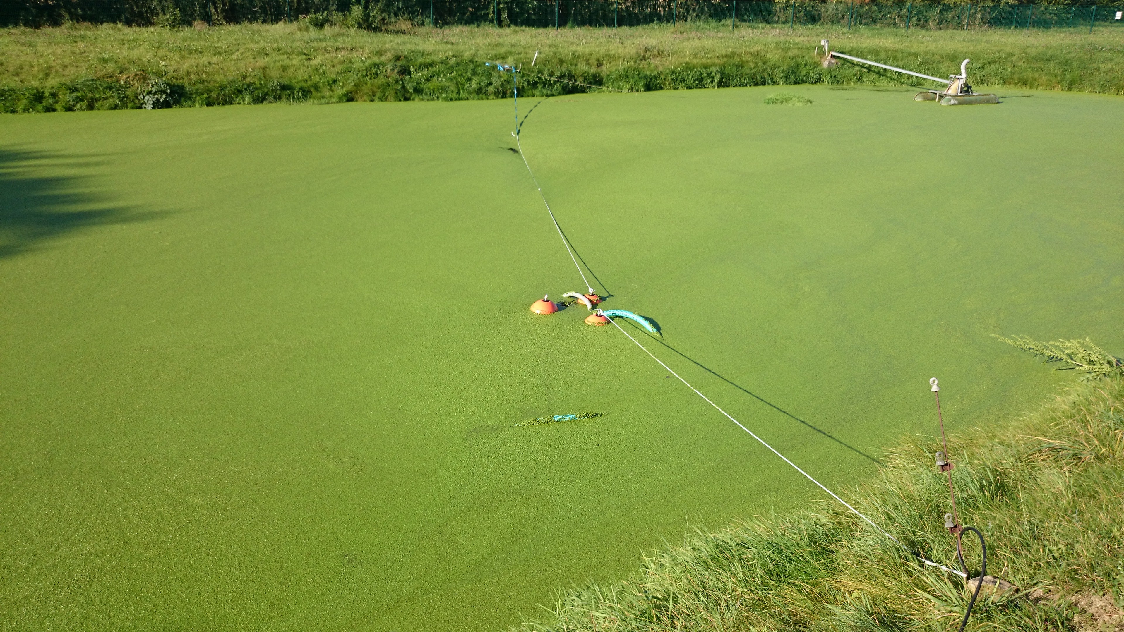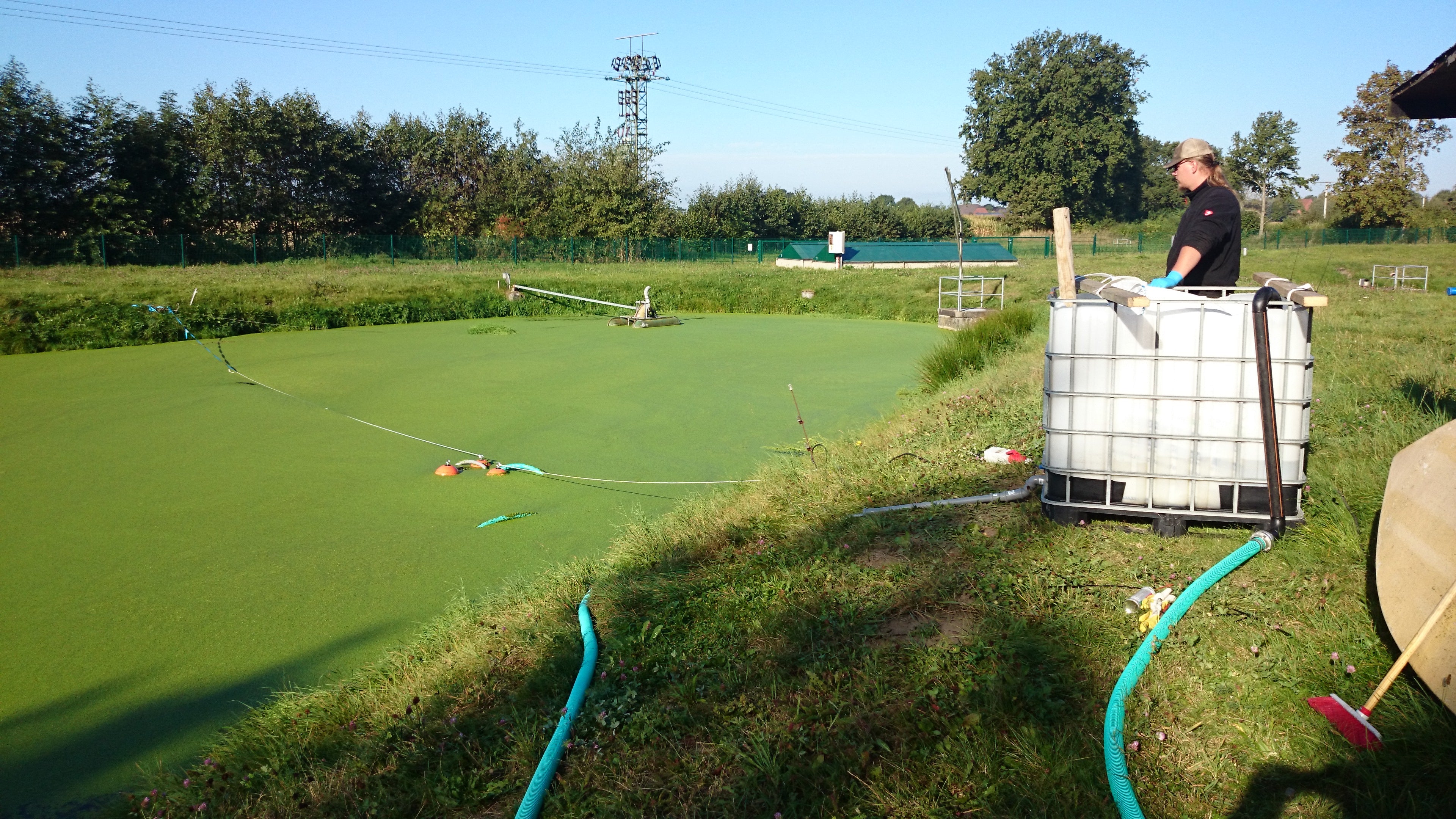 A free-floating 8-FSP scum skimmer was used. The entire pond surface of 500 m² was cleaned. In three hours, 7 cubic meters of duckweed were suctioned into prepared containers.