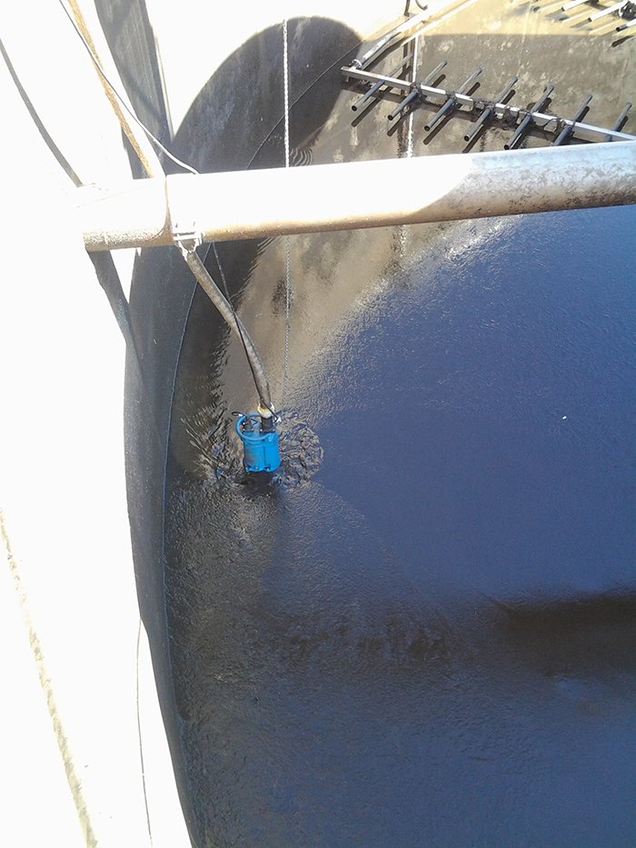 Pumping of activated sludge in a community sewage treatment plant. Basin depth: 6m. For the service and inspection of the ventilation system, the activated sludge tanks are emptied every two years. The activated sludge has a dry substance content of 1.5 to 2%. During emptying of the basin, the circulation and mixing of the sludge is turned off, and the sludge forms a sediment on the bottom. Pumping time 2 days. In the floor of the basin there is a 100mm deep sump, meaning that when the basin is emptied the sludge remains lying on the bottom. It must be removed.